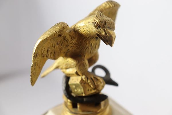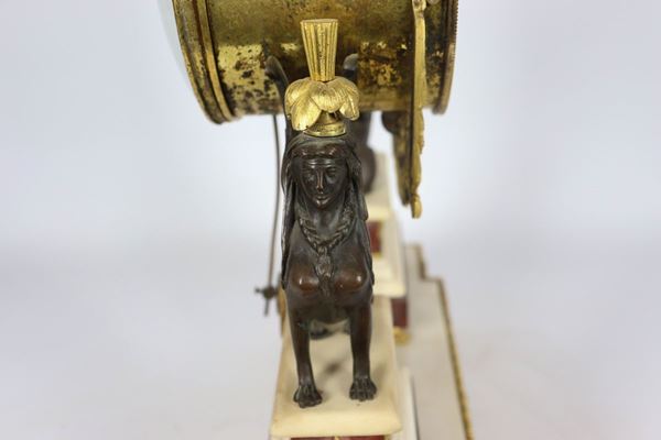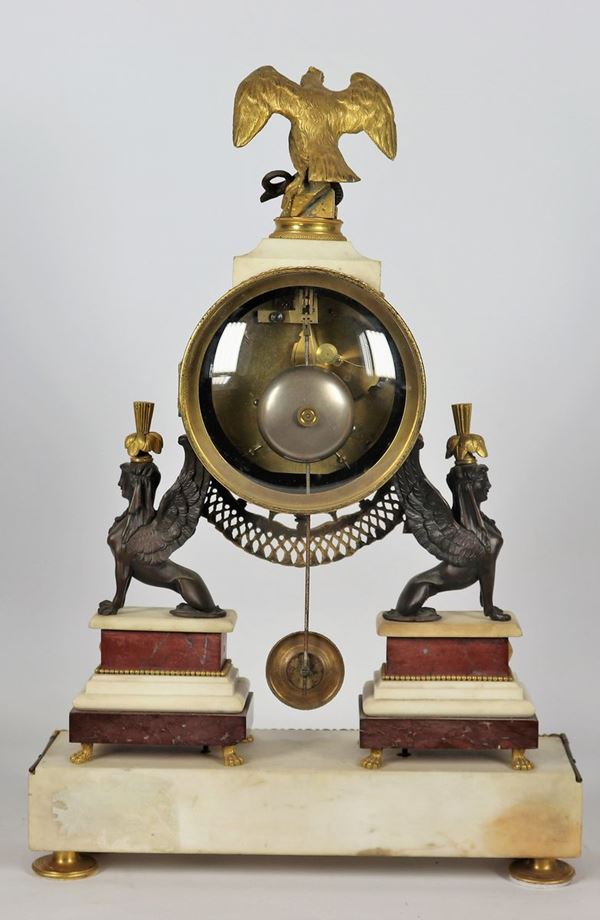 in bronzo dorato, sbalzato e cesellato a motivi neoclassici con sculture di sfingi e aquila centrale, marmo rosso di Francia e bianco statuario, quadrante tondo in smalto bianco e ore a cifre romane. Non funzionante da revisionare, cm 35 x 11 x 52 h.