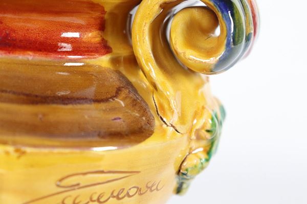 Piccolo vaso con coperchio in terracotta maiolicata e smaltata. Firmato Ferraro