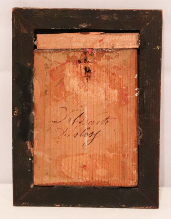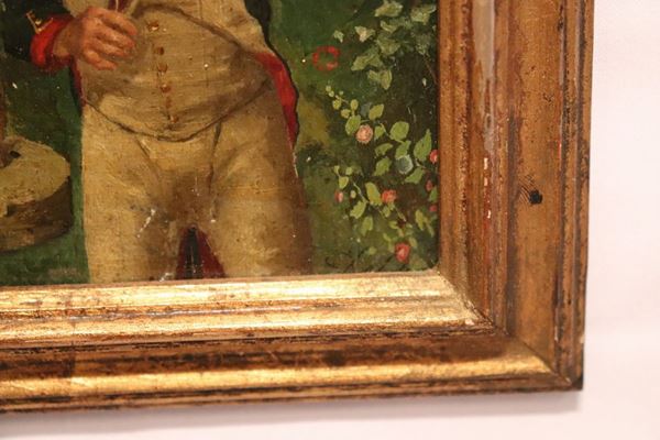 "Soldato Francese con fiasco di vino". Firmato, piccolo dipinto ad olio su tavoletta