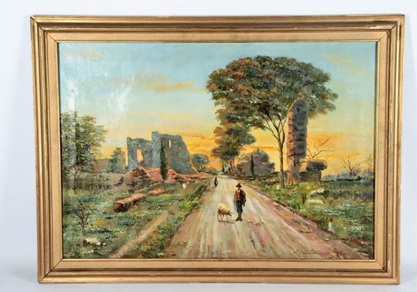 "Veduta dell'Appia Antica con pastorello e contadina" dipinto ad olio su tela