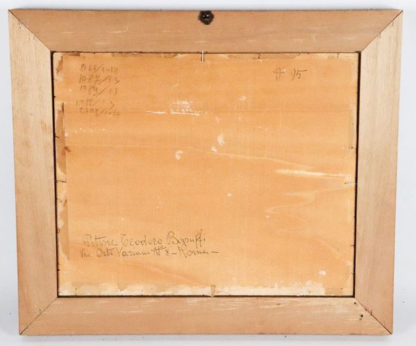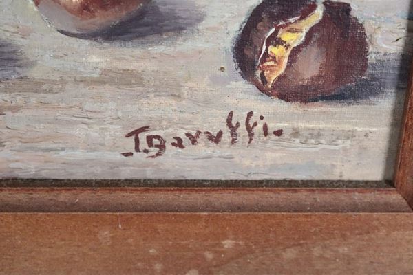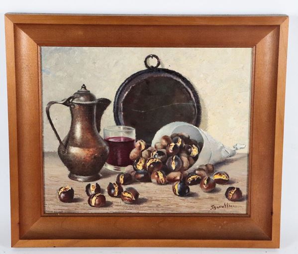 "Natura morta con castagne e brocca". Firmato, piccolo dipinto ad olio su tavoletta