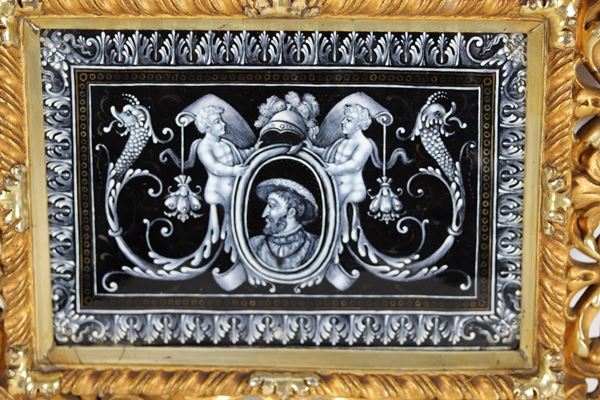Placca in smalto di Limoges "Nobiluomo con elmo, putti e teste di drago"