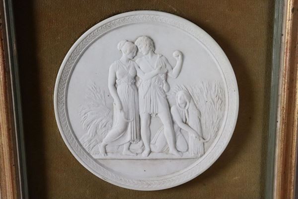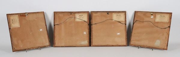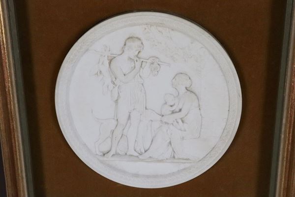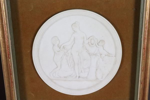 a motivi storico-mitologici, montati su pannelli in velluto con cornicette in legno dorato. Diametro cm 13,5 ciascuno, cornice cm 23 x 23 ciascuna.