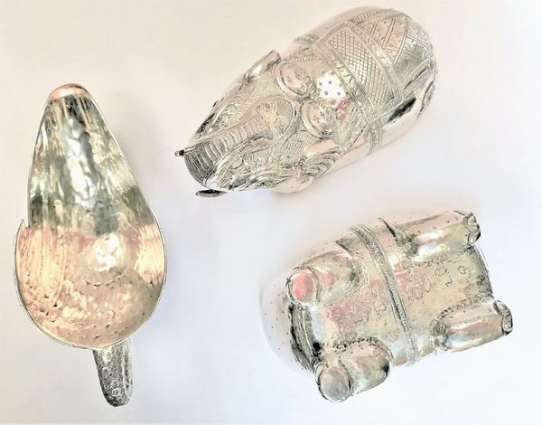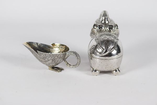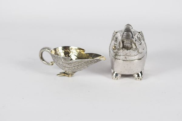 Scatola a forma di "Elefante" e tazza a forma di "Cigno" in argento gr 300