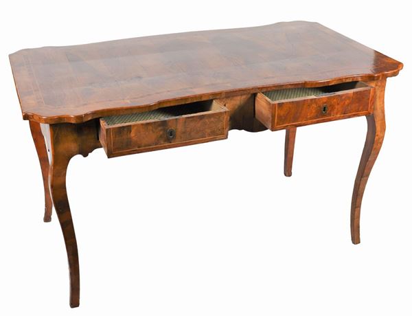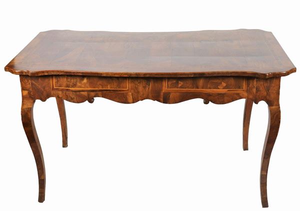 Scrivania da centro marchigiana Luigi XV in noce e radica di ulivo