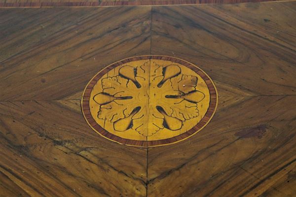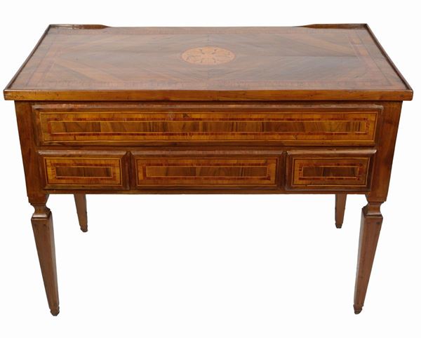 con intarsi a filettature e rosone sul piano, un tiretto centrale e due sottostanti, quattro gambe a piramide rovesciata, cm 107 x 58 x 80 h.