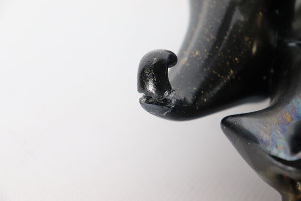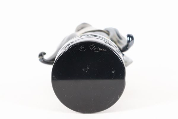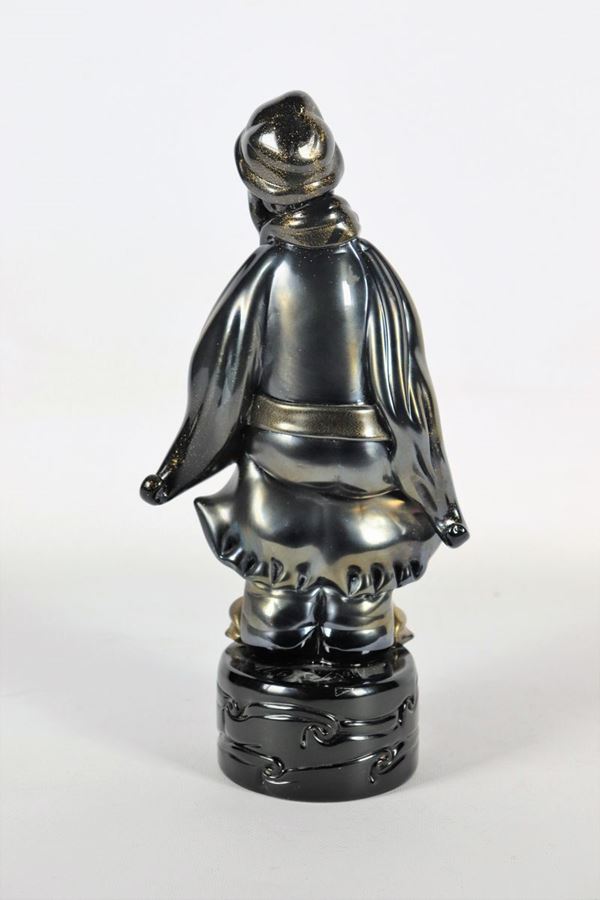 Scultura "Santone cinese" in vetro di Murano color bronzo. Firmata E. Moroni