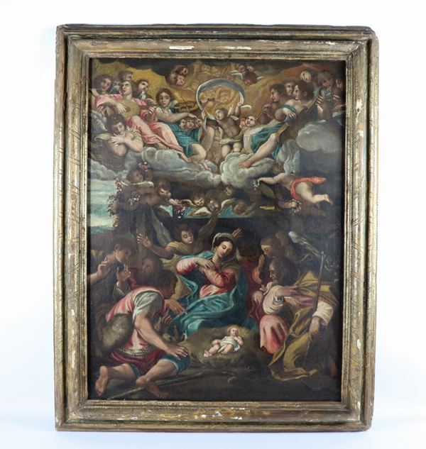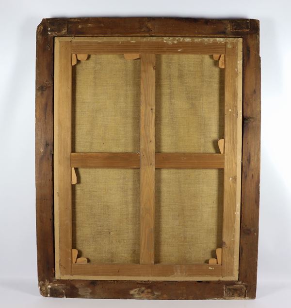 in antica cornice dell'epoca dorata e laccata a finto marmo. Il dipinto è rintelato e la cornice presenta difetti, cm 99 x 76.