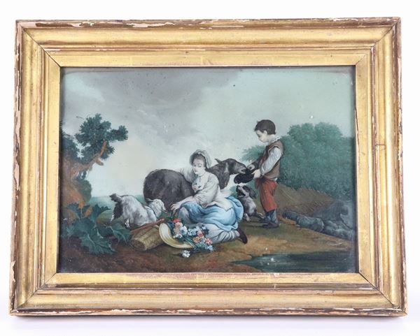 "Paesaggio con pastorelli, pecorelle e cagnolino" dipinto ad olio sottovetro