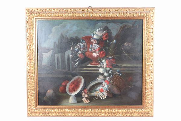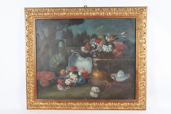 "Nature morte di fiori, frutta e vasellame", coppia di dipinti ad olio su tela