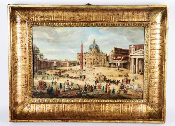 "Veduta di Piazza San Pietro con carrozze e personaggi" dipinto ad olio su rame