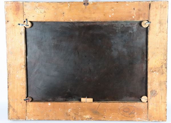 di fine qualità pittorica e luminoso contrasto cromatico. Cornice in legno dorato ed intagliato, cm 31,5 x 47.