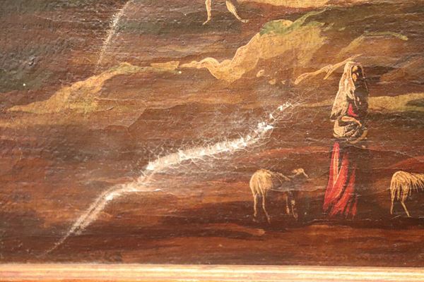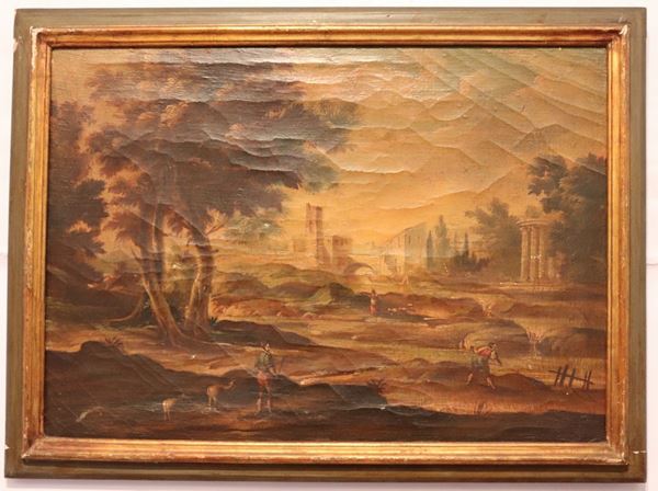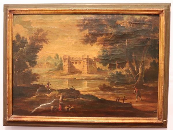 "Paesaggi con castello, ruderi e pastori con greggi" coppia di dipinti ad olio su tela