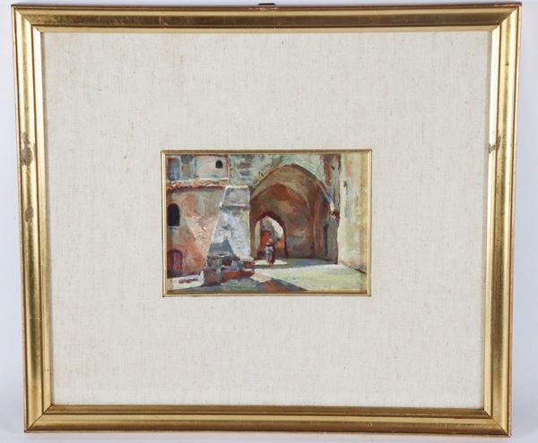 "Scorcio di vicolo di paese con popolana" piccolo dipinto ad olio