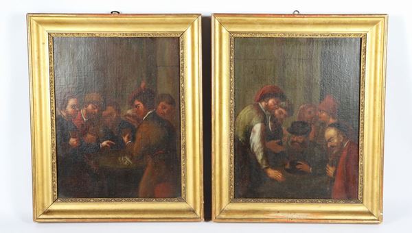 "Interni di locanda con giocatori di carte" coppia di piccoli dipinti ad olio su tela