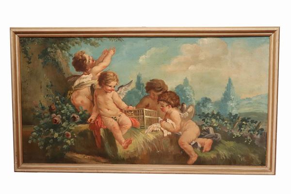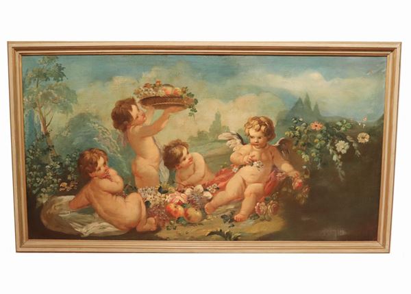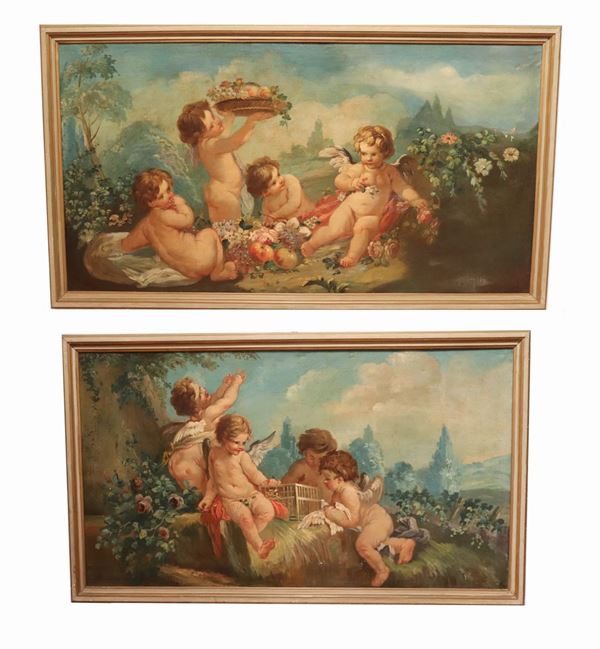 "Allegorie di Putti festanti" coppia di dipinti ad olio