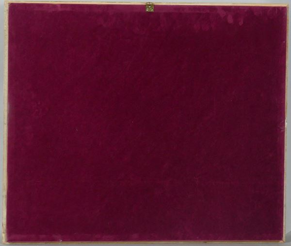 in cornice decapè e passepartout rosso, cm 18 x 26.