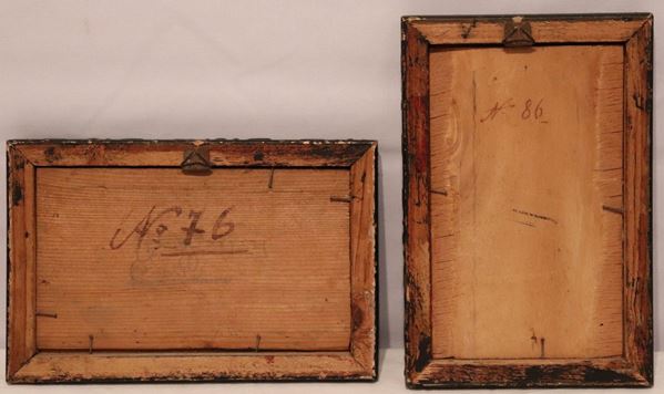 in cornici laccate nere, uno orizzontale cm 10 x 17,5, uno verticale cm 14,3 x 10,5.