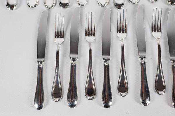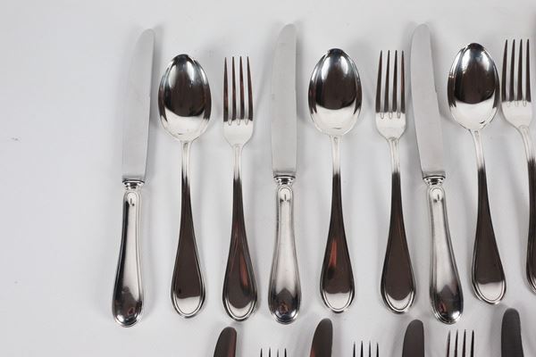 composto da: 12 cucchiai grandi, 11 forchette grandi, 12 coltelli grandi, 7 forchette piccole e 12 coltelli piccoli.