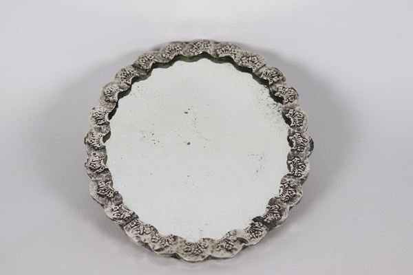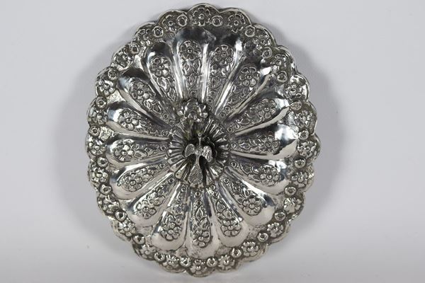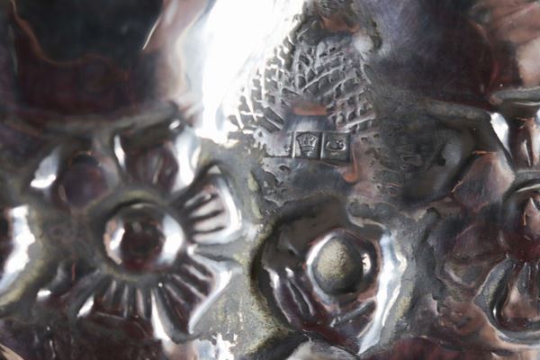 interamente cesellato e sbalzato a motivi di fiori ed uccello esotico, cm 18 x 22.