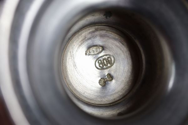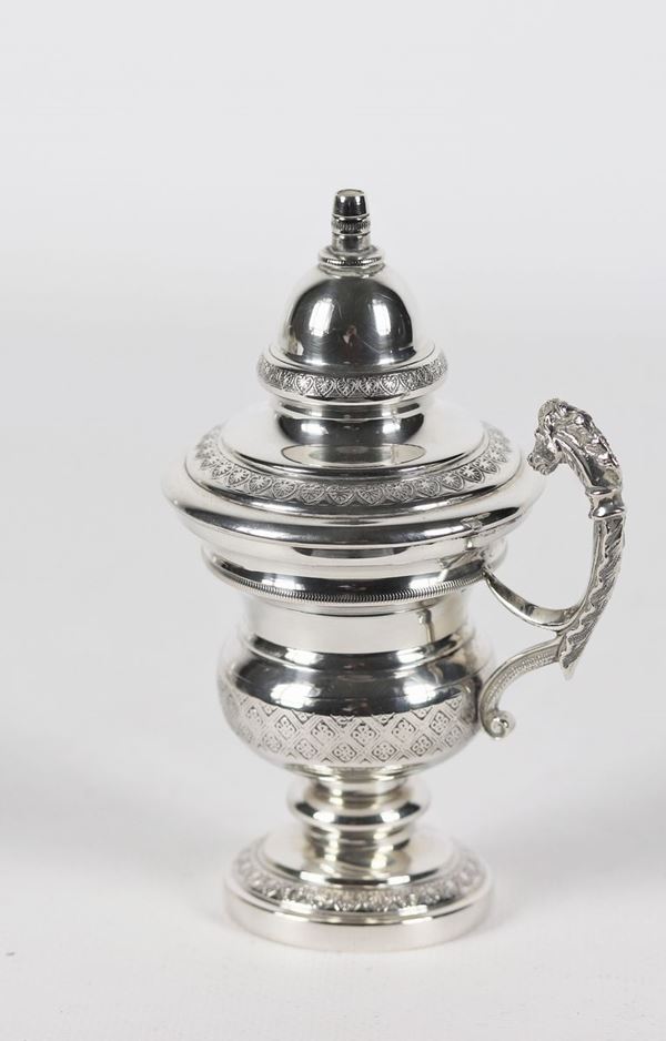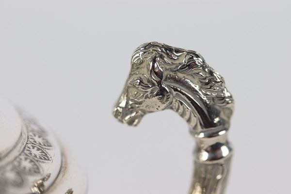 cesellata e sbalzata a motivi Impero con manico a forma di testa di cavallo. Altezza cm 12,5.