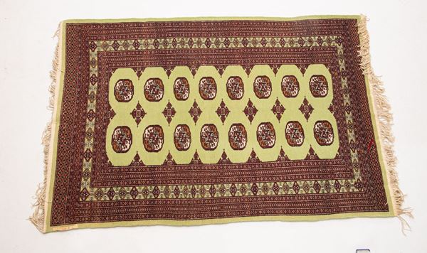 a motivi geometrici su fondo verde e rosso. Misura mt. 1,90 x 1,27.