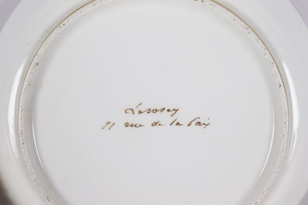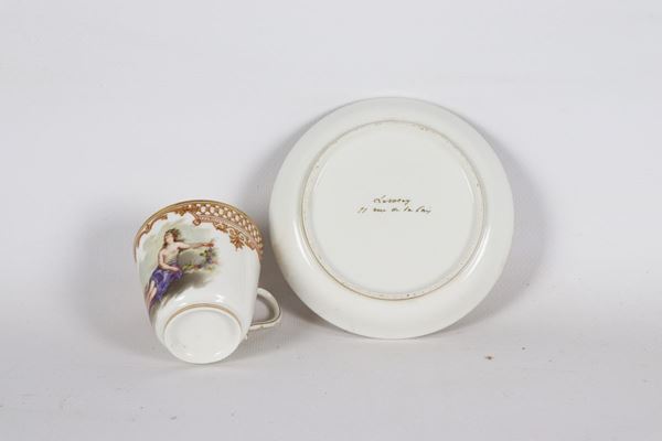 Tazza con piatto francese in porcellana bianca e oro con scena dipinta "Nudo di donna con fiori"