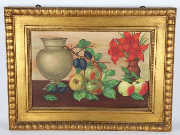 "Natura morta di fiori, vasellame e frutta". Firmato, dipinto ad olio su tela