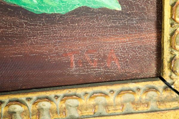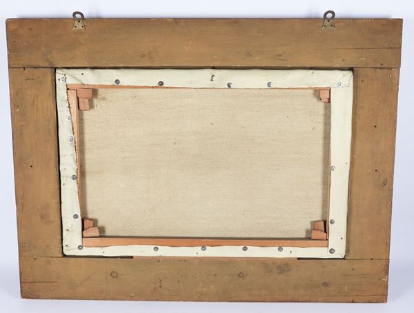 opera del Tita pittore e collezionista d'arte. Nei suoi dipinti ritrae soggetti di interni di osterie, paesaggi della campagna bresciana, cacciagione e nature morte. Cornice in legno dorato, cm 39 x 60.