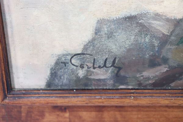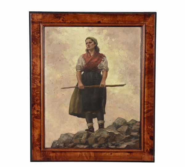 "La pastorella sul promontorio". Firmato, dipinto ad olio su compensato