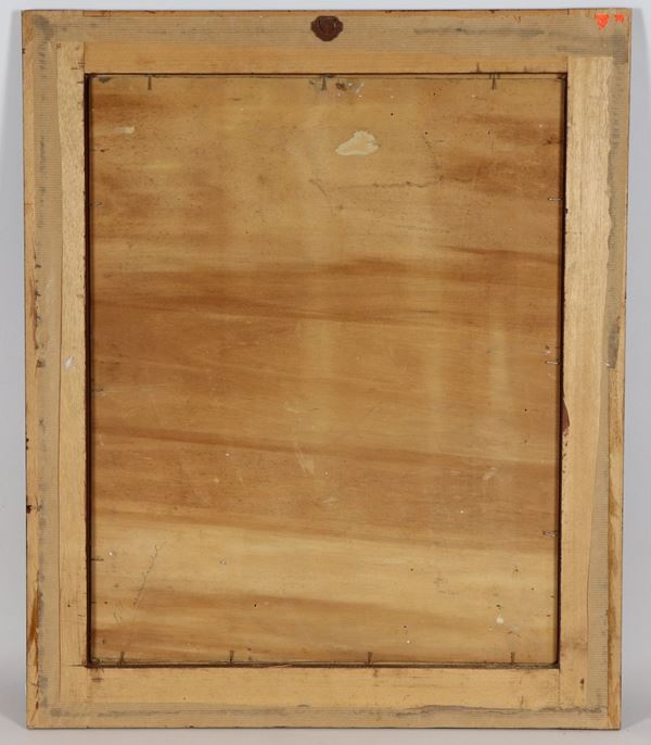 in cornice in radica di noce. Il compensato presenta qualche segno di tarlo, cm 50 x 40.