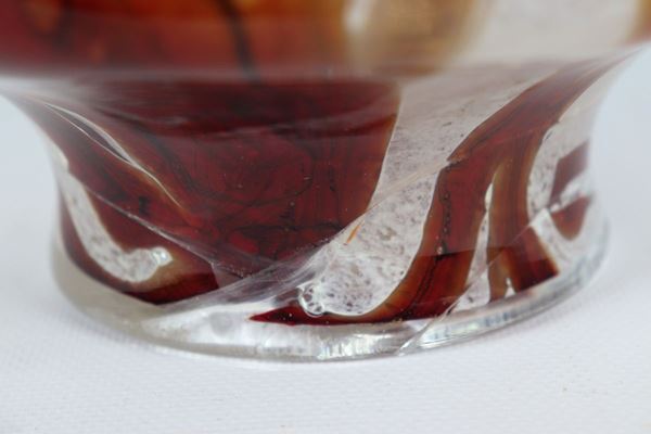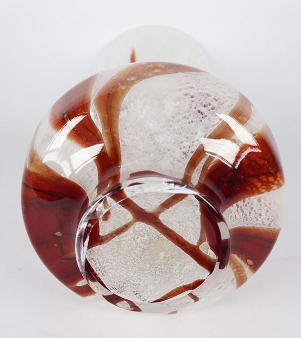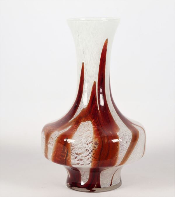 Vaso in vetro soffiato di Murano con colate marroni su fondo bianco