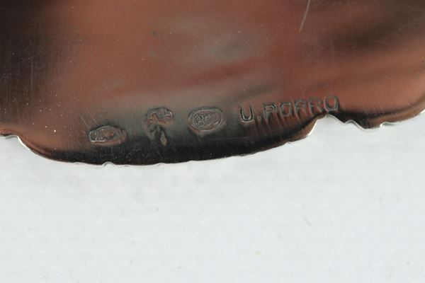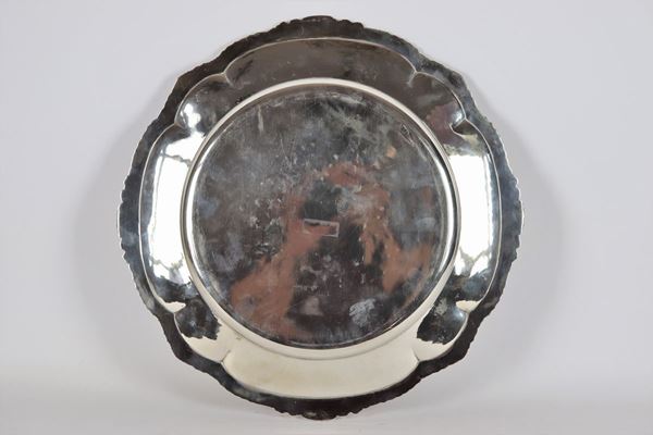 bordo sbalzato e cesellato a baccellature, fogliame e conchiglie, diametro cm 40.
