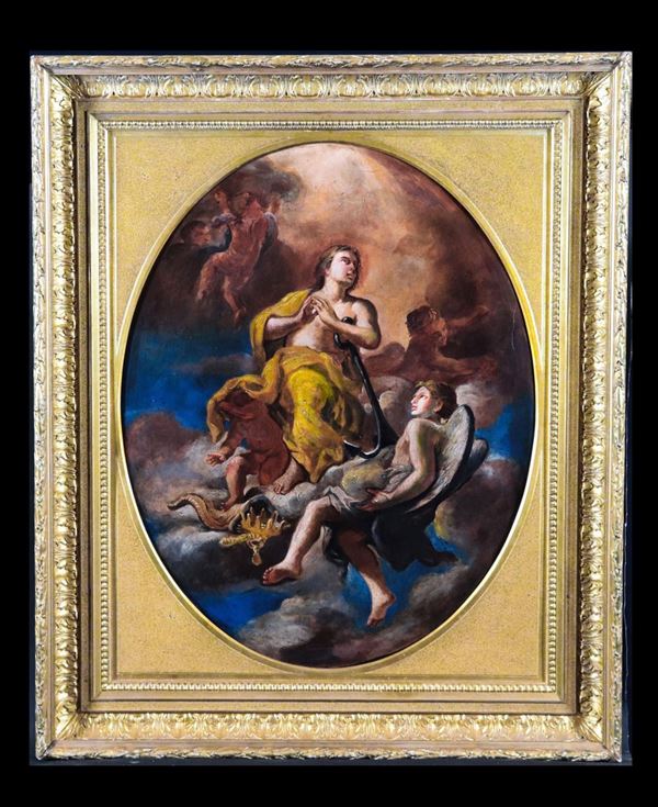 "Allegorie di Santi con angeli e putti" coppia di dipinti ovali ad olio su tela
