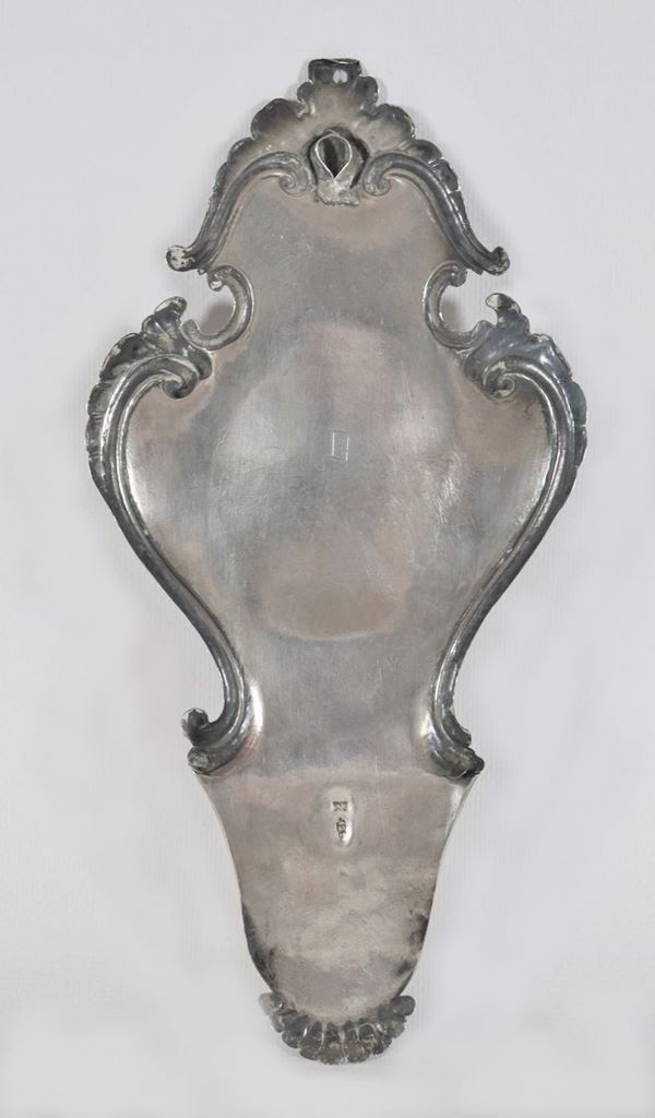 cesellata e sbalzata a motivi Luigi XV. Qualche piccola ammaccatura, cm 13 x 26 h.
