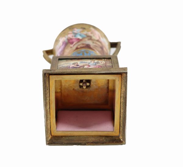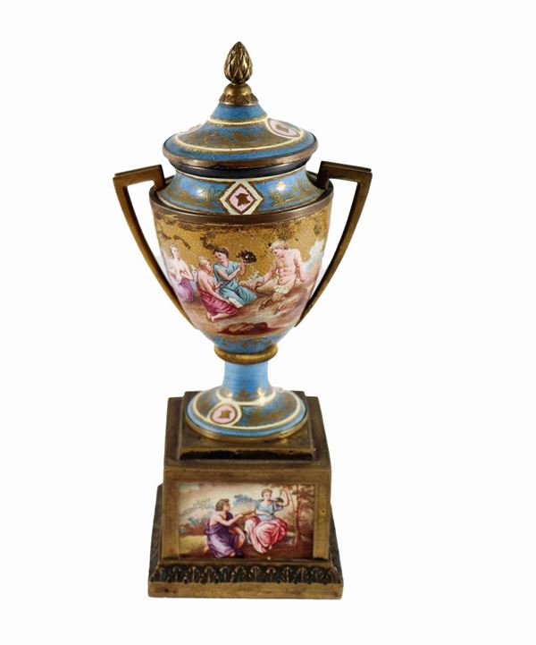 Antica piccola anfora in bronzo dorato rivestita con placchette in smalto di Vienna