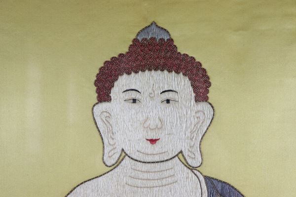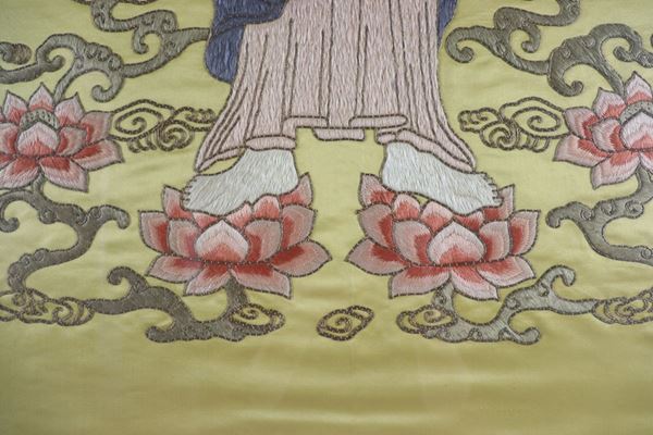 Antico pannello ricamato e dipinto su seta "Divinità orientale"