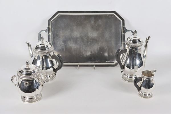 con manici in legno ebanizzato composto da: caffettiera, teiera, lattiera, zuccheriera e vassoio ottagonale con manici. Altezza massima cm 24,5, vassoio cm 53 x 31.