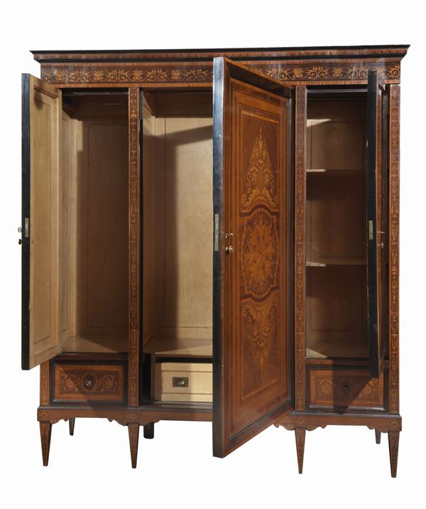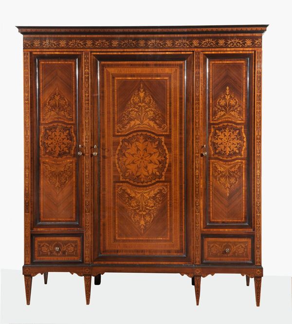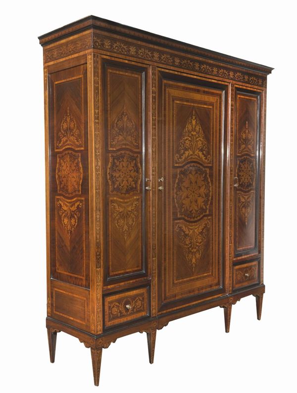 Armadio a tre sportelli e due tiretti in ebano viola e bois de rose