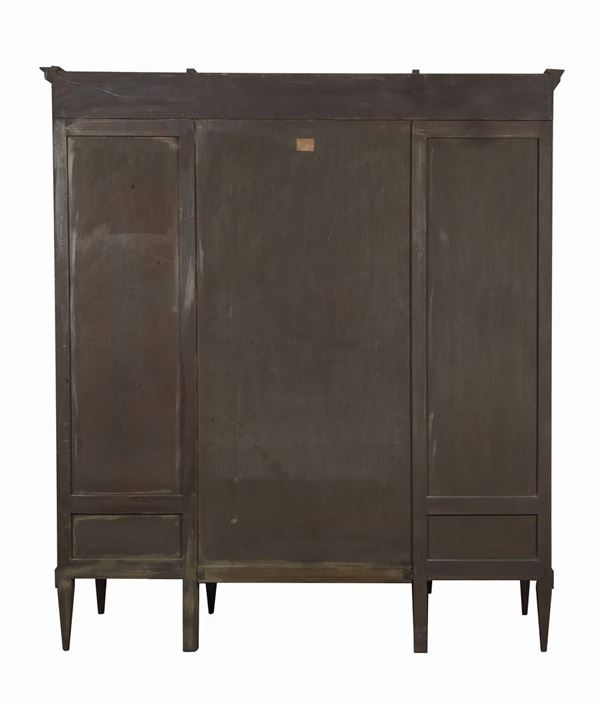 con riquadri e montanti intarsiati a motivi neoclassici di rosoni con fiori, volute floreali intrecciate e calatine. L'interno in acero con un tiretto e ripiani, otto gambe a tronco di piramide rovesciata, cm 200 x 60 x 223 h.