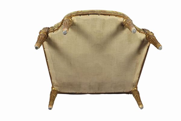 con intagli a motivi neoclassici, sei gambe e copertura in tessuto fiorato, cm 80 x 63 x 110 h.
