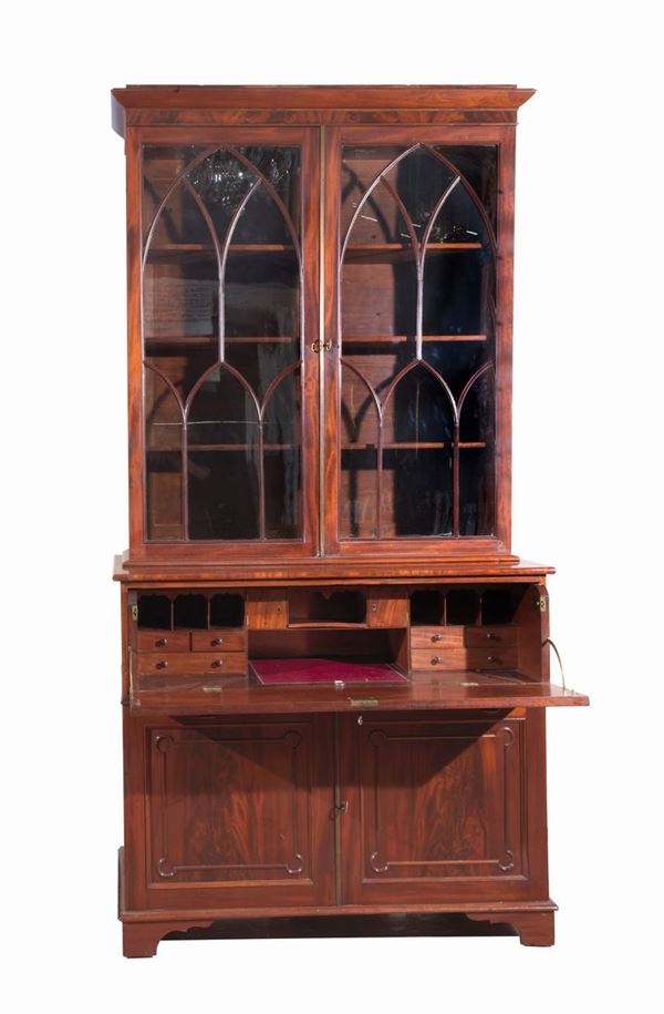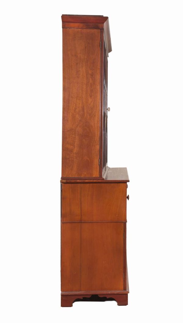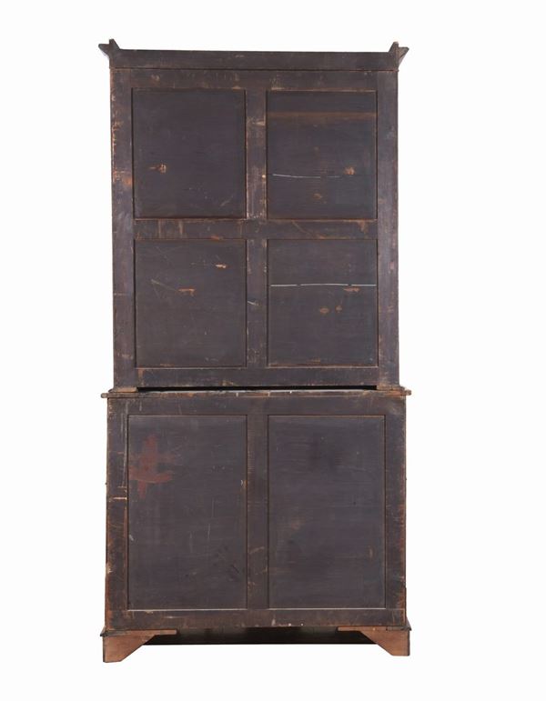 la parte superiore a vetrina con due sportelli, la parte inferiore con tiretto a calatoia formante scrittoio e due sportelli sottostanti, cm 125 x 57 x 248 h.