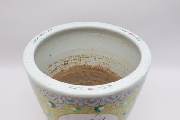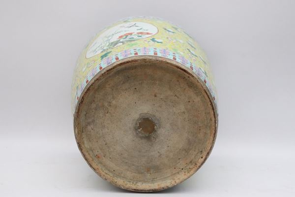 interamente decorato e variopinto con smalti a rilievo a motivi di fiori e uccelli. Annessa base in legno, diametro cm 37 x 32 h.