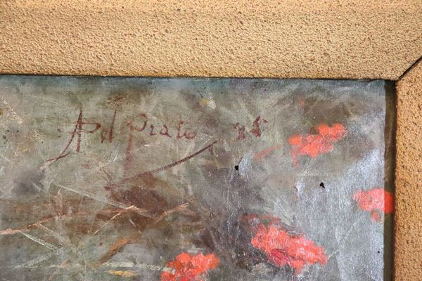 "Campagna fiorita con muretto a secco". Firmato e datato. Dipinto ad olio su tela