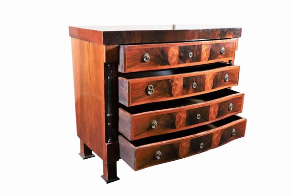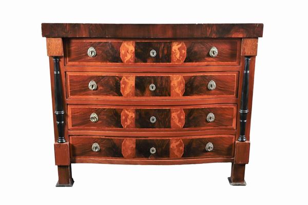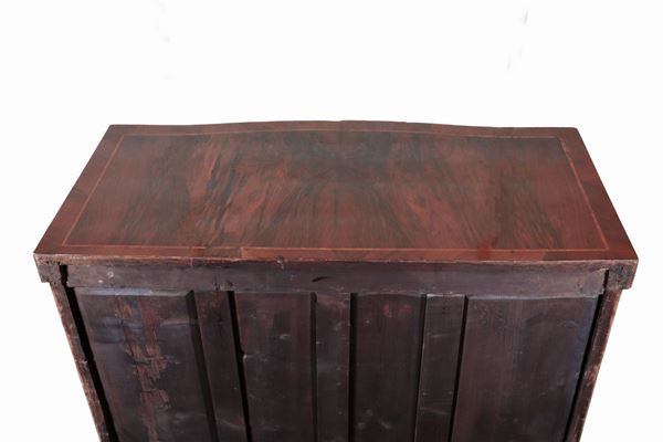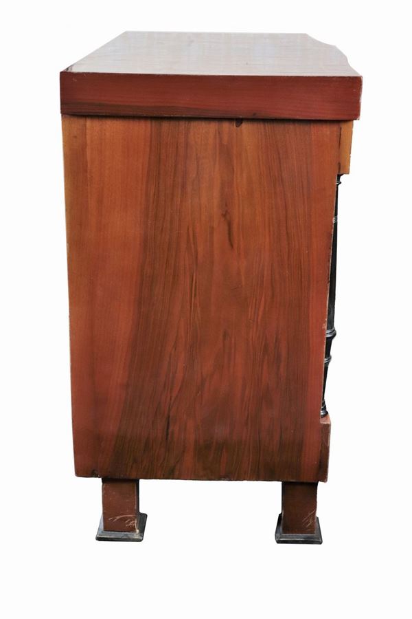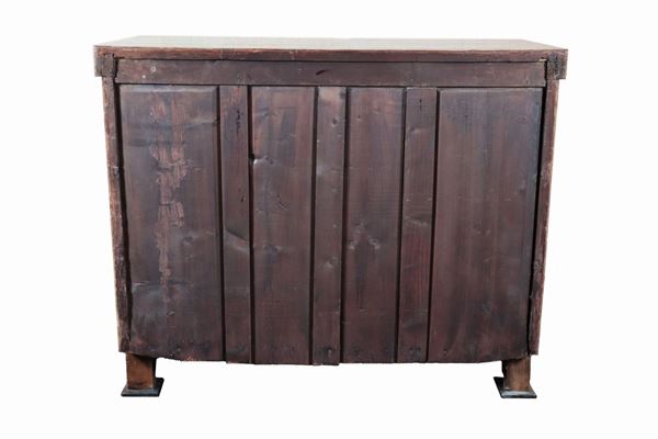 con filettature intarsiate e montanti a colonnine ebanizzate e tornite, quattro tiretti con frontali intarsiati a motivi di figure di cupidi, cm 117 x 55 x 98 h.