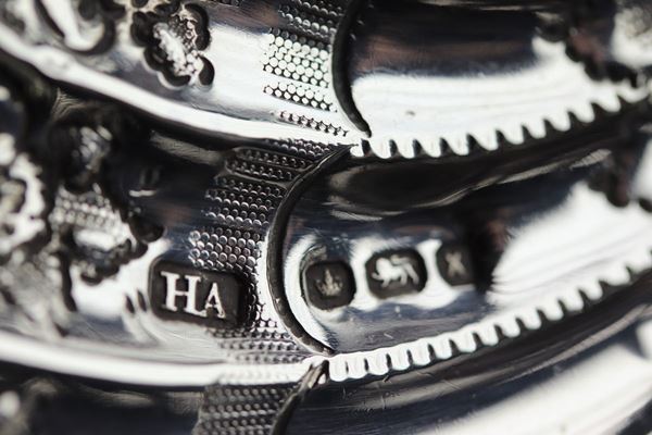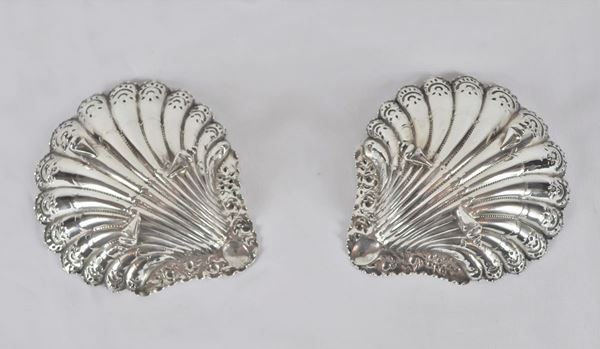 interamente cesellate e sbalzate a motivi floreali, sorrette da tre piedini a forma di piccole conchiglie, cm 15 x 13 ciascuna.