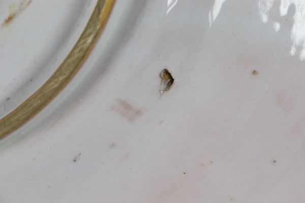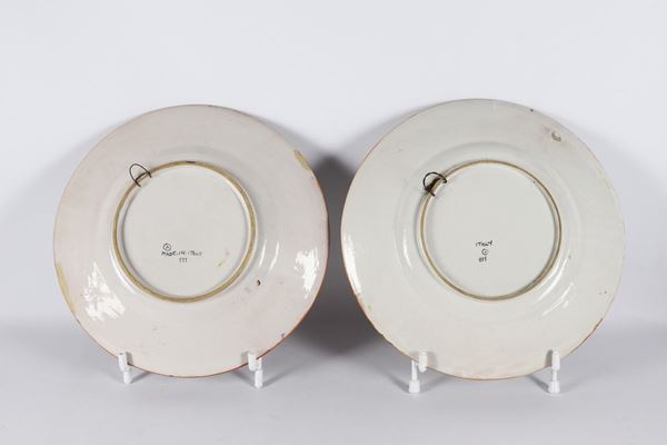 interamente decorati e variopinti a motivi cinquecenteschi policromi su fondo bianco. Un piatto presenta lieve vecchio restauro sul bordo, diametro cm 44 ciascuno.