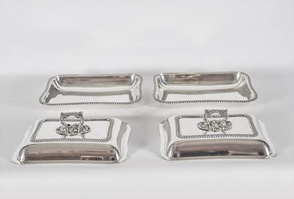 a forma rettangolare con manici e profili sbalzati e cesellati, cm 29 x 22 ciascuna.