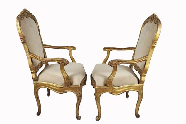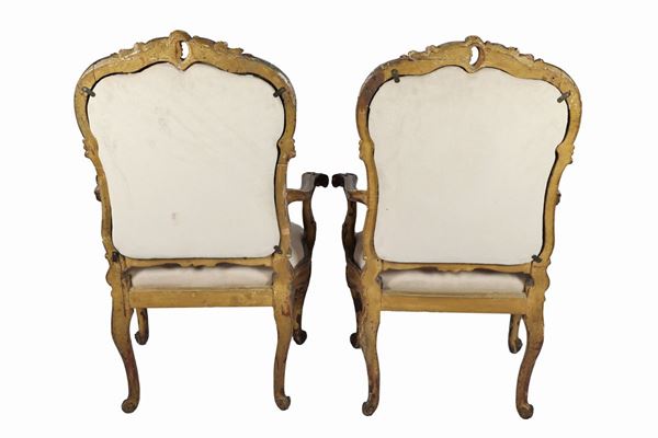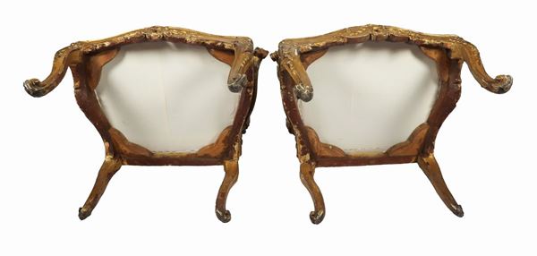 con intagli a motivi di fiori, ricci e foglie, copertura in velluto avana. Difetti, cm 71 x 50 x 110 h ciascuna.
