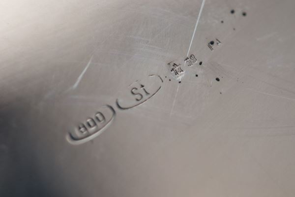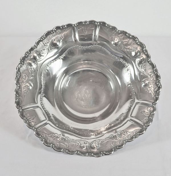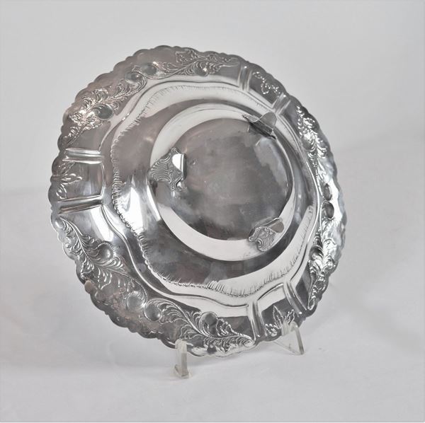 con bordo cesellato e sbalzato a volute di foglie d'acanto e conchiglie, sorretta da tre piedini ricurvi. Diametro cm 27 x 8 h.